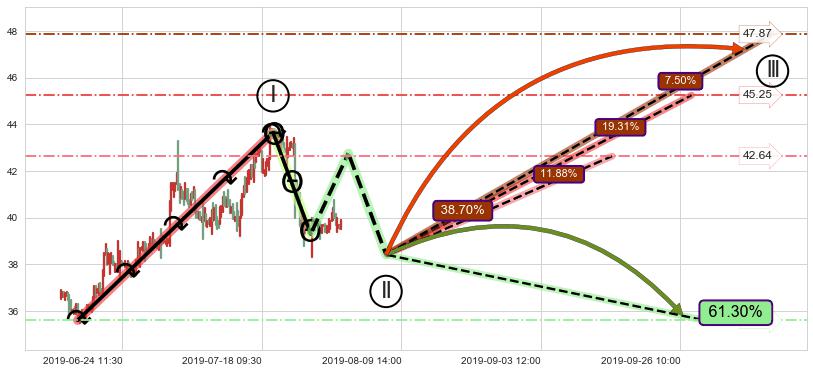 ➣ 高概率大级别循环上涨浪被破坏,反转向下(突破5浪起点)概率61.30%