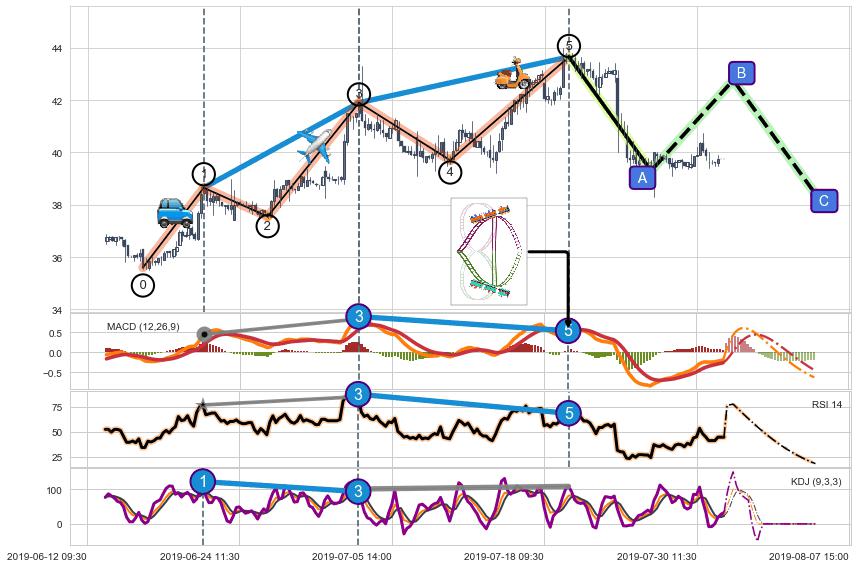 ➢ 1,3,5驱动浪MACD, RSI, KDJ走势都出现【常规背离】反转信号增强