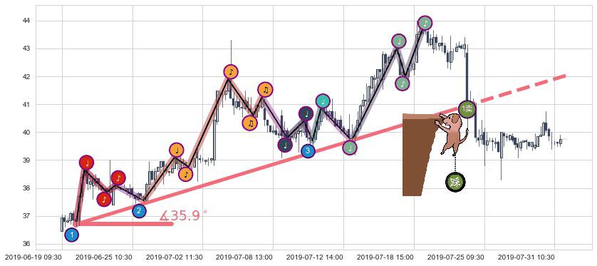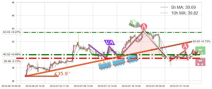 ✂️ 2019-06-19 15:00-2019-07-22 14:00上升趋势存在反转[风险],其原上升趋势的支撑位(42.03)已破位[强阻力信号],原上升趋势角度: 35.9˚