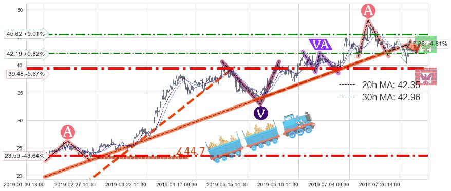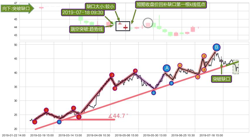 ✂️ 2019-01-30 13:00-2019-07-22 15:00上升趋势存在反转[风险],虽然原上升趋势的支撑位(43.86)已破位,但其支撑效果尚存,原上升趋势角度: 44.7˚