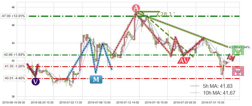 ♘ 阻力价格位42.66,可信任强度67.46%,距离最后交易2019-07-31 15:00形成的收盘价格41.85相差 +1.93%
