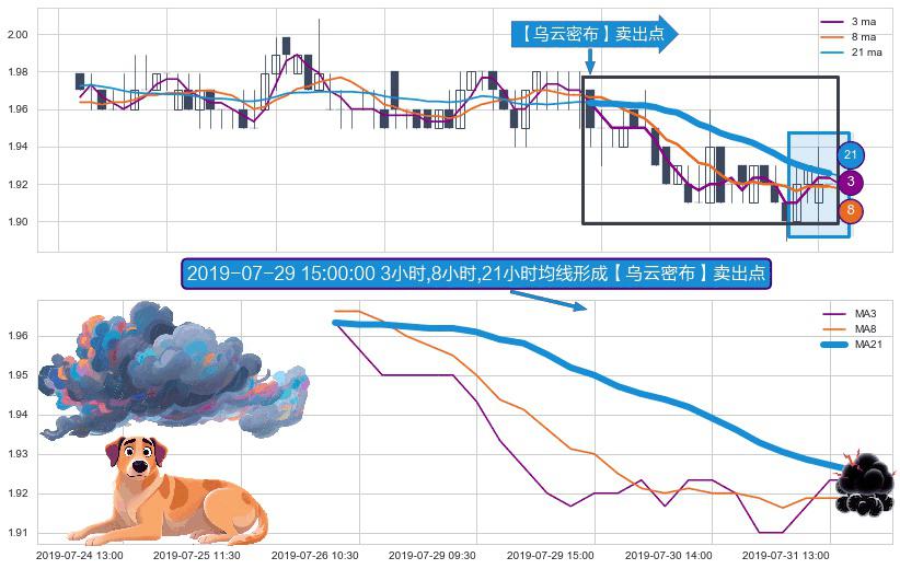 ⚀ 2019-07-26 09:30:00小时-2019-07-31 14:00:00小时显现 3小时-8小时-21小时均线 【乌云密布】卖出点 看空信号,后市看跌,卖出