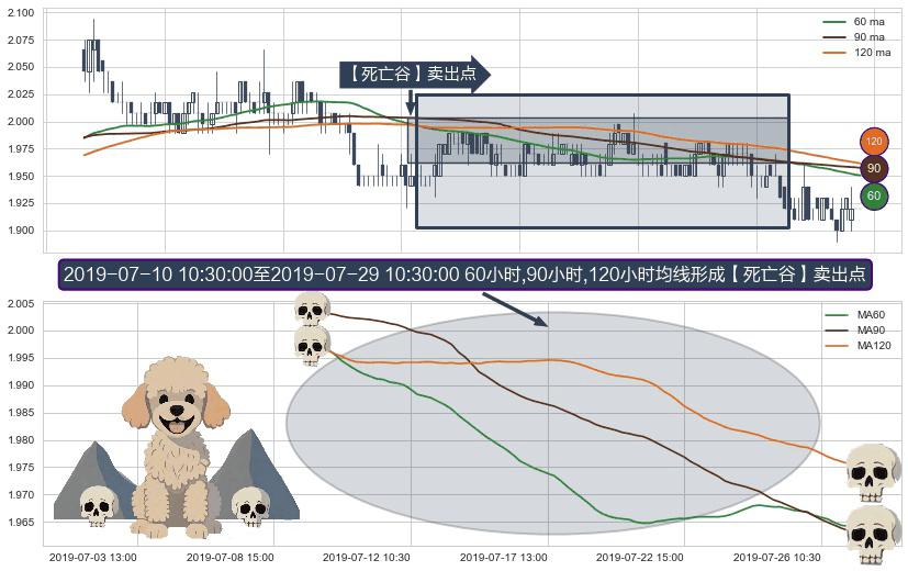 ⚀ 2019-07-10 11:30:00-小时至2019-07-29 10:30:00-小时显现 60小时-90小时-120小时均线 【死亡谷】卖出点 看空信号,后市看跌,卖出