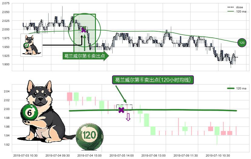 ⚀ 2019-07-05 13:00:00-小时显现 葛兰威尔均线 120小时均线 第⑥卖出点 走势反转见顶信号,后市看跌,卖出信号