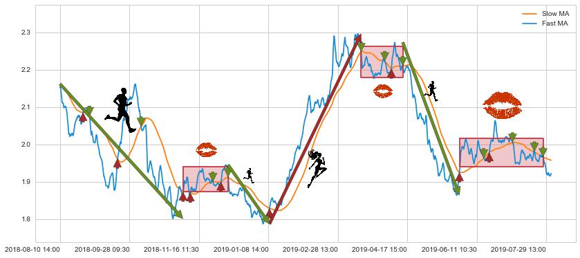 05-28 15:00至07-26 09:30 慢线与快线多次接触,存在上下穿越,有缠绕