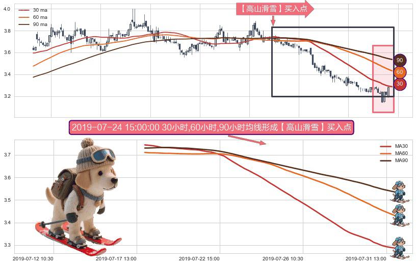 形态多维评估: ⚀ 2019-07-17 15:00:00小时-2019-07-31 15:00:00小时显现 30小时-60小时-90小时均线 【高山滑雪】买入点 看多信号,后市看涨,买入