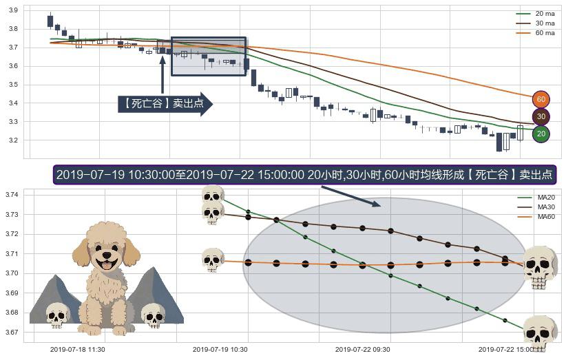 形态多维评估: ⚀ 2019-07-19 11:30:00-小时至2019-07-22 15:00:00-小时显现 20小时-30小时-60小时均线 【死亡谷】卖出点 看空信号,后市看跌,卖出