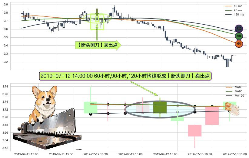 形态多维评估: ⚀ 2019-07-12 14:00:00小时显现 60小时-90小时-120小时均线 【断头铡刀】卖出点 看空信号,后市看跌,卖出