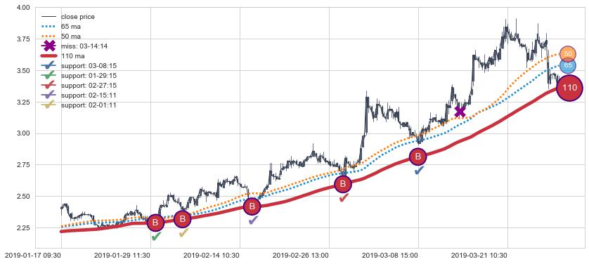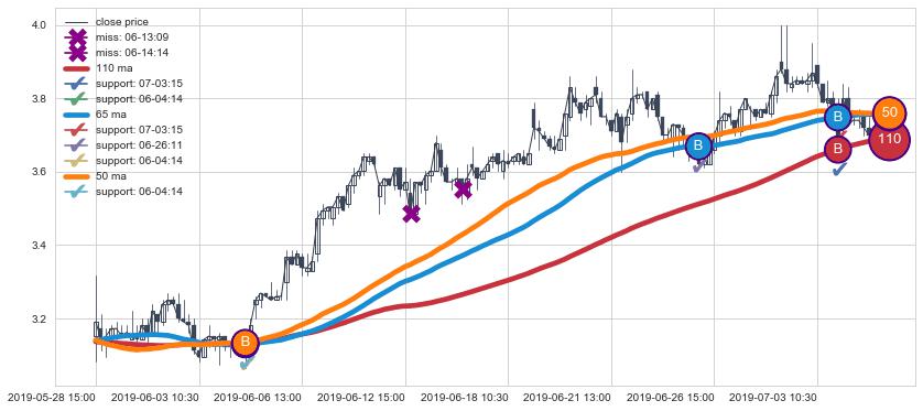 上涨趋势05-28 15:00-07-05 09:30,均线65, 50, 110确认关键支撑3处
