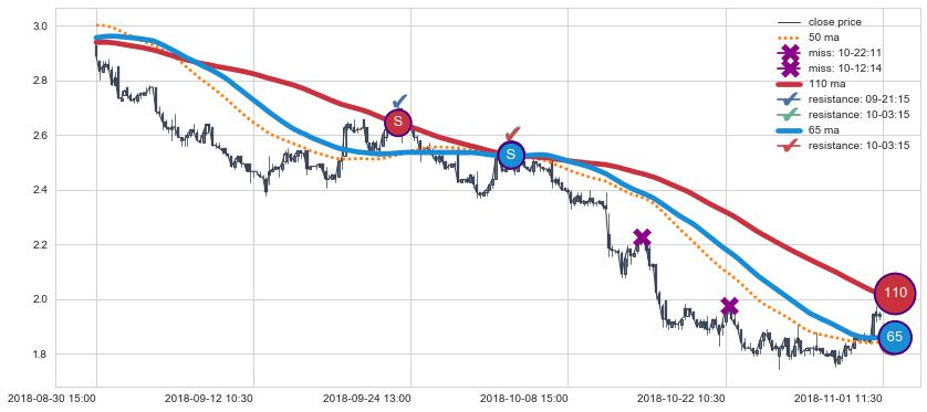 下跌趋势08-30 15:00-11-01 11:30,均线65, 110确认关键阻力2处