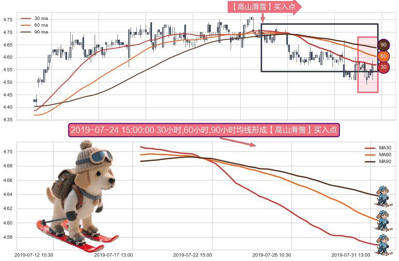 形态多维评估: ⚀ 2019-07-17 15:00:00小时-2019-07-31 15:00:00小时显现 30小时-60小时-90小时均线 【高山滑雪】买入点 看多信号,后市看涨,买入