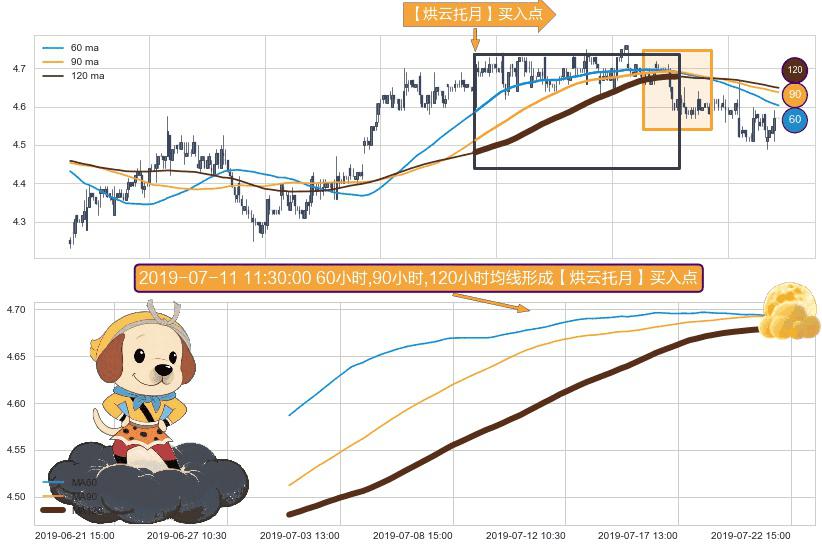 形态多维评估: ⚀ 2019-07-02 09:30:00小时-2019-07-22 13:00:00小时显现 60小时-90小时-120小时均线 【烘云托月】买入点 看多信号,后市看涨,买入