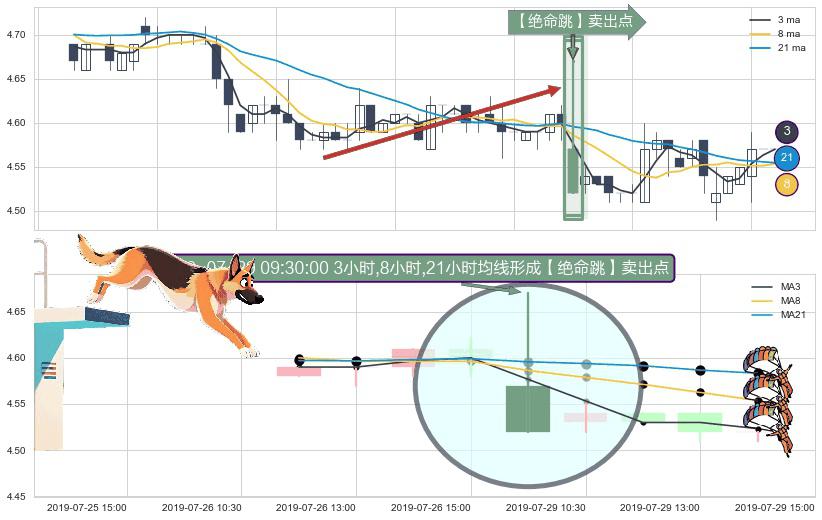 形态多维评估: ⚀ 2019-07-29 09:30:00小时显现 3小时-8小时-21小时均线 【绝命跳】卖出点 看空信号,后市看跌,卖出