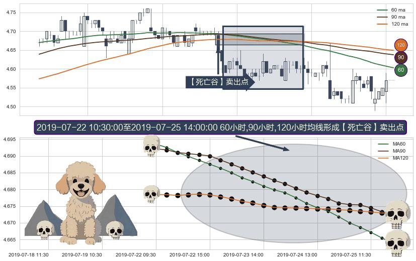 形态多维评估: ⚀ 2019-07-22 11:30:00-小时至2019-07-25 14:00:00-小时显现 60小时-90小时-120小时均线 【死亡谷】卖出点 看空信号,后市看跌,卖出