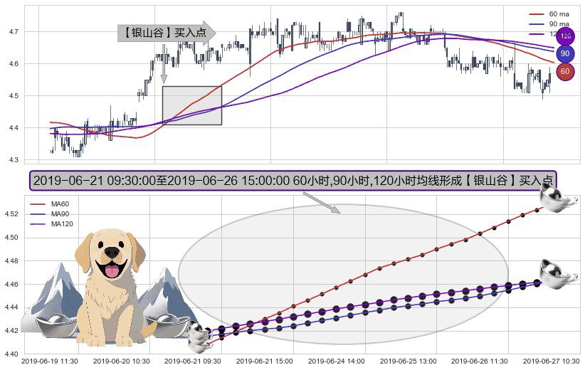 形态多维评估: ⚀ 2019-06-21 10:30:00-小时至2019-06-26 15:00:00-小时显现 60小时-90小时-120小时均线 【银山谷】买入点 看多信号,后市看涨,买入