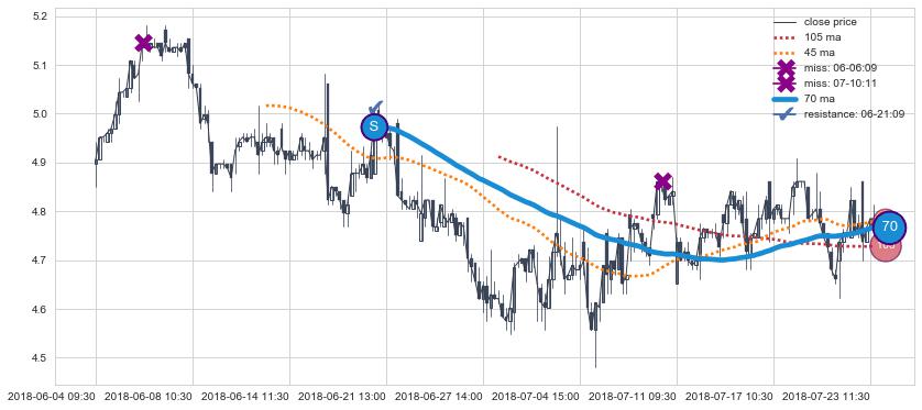下跌趋势06-04 09:30-07-23 13:00,均线70确认关键阻力1处