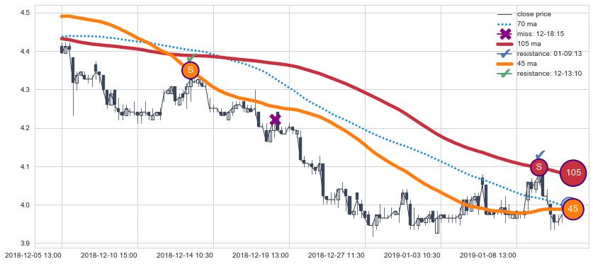 下跌趋势12-05 13:00-01-10 13:00,均线105, 45确认关键阻力2处