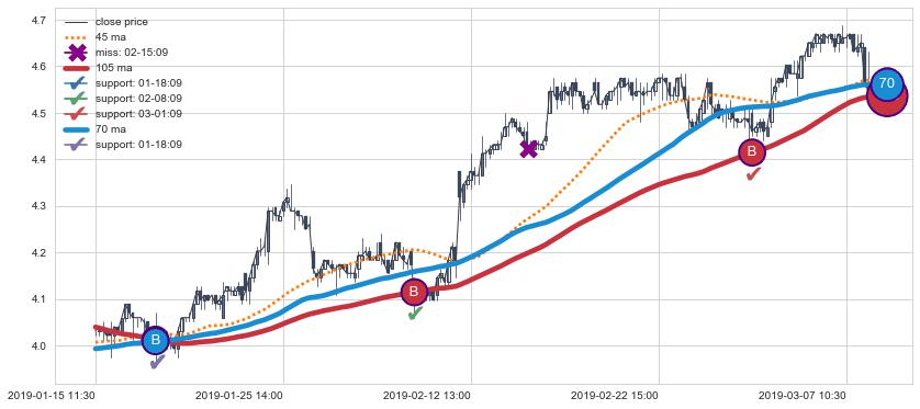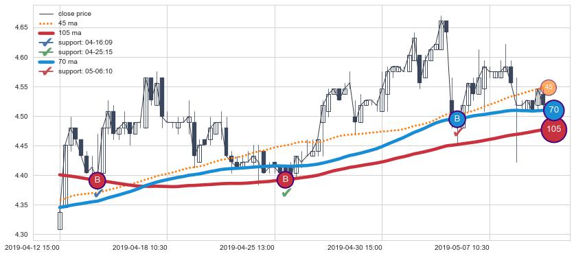 上涨趋势04-12 15:00-05-08 15:00,均线105, 70确认关键支撑3处