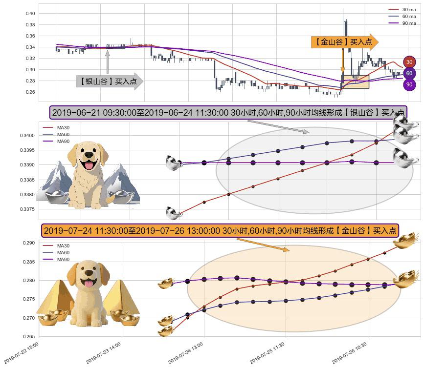 ⚃ 2019-07-24 13:00:00-小时至2019-07-26 13:00:00-小时显现 30小时-60小时-90小时均线 【金山谷】买入点 其再次确认了买入信号,可靠性更强,买入