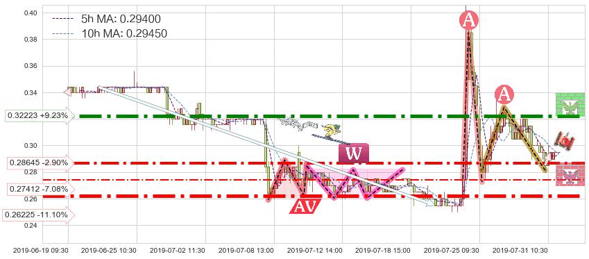 ♘ 阻力价格位0.32223,可信任强度85.83%,距离最后交易2019-07-31 15:00形成的收盘价格0.29500相差 +9.23%