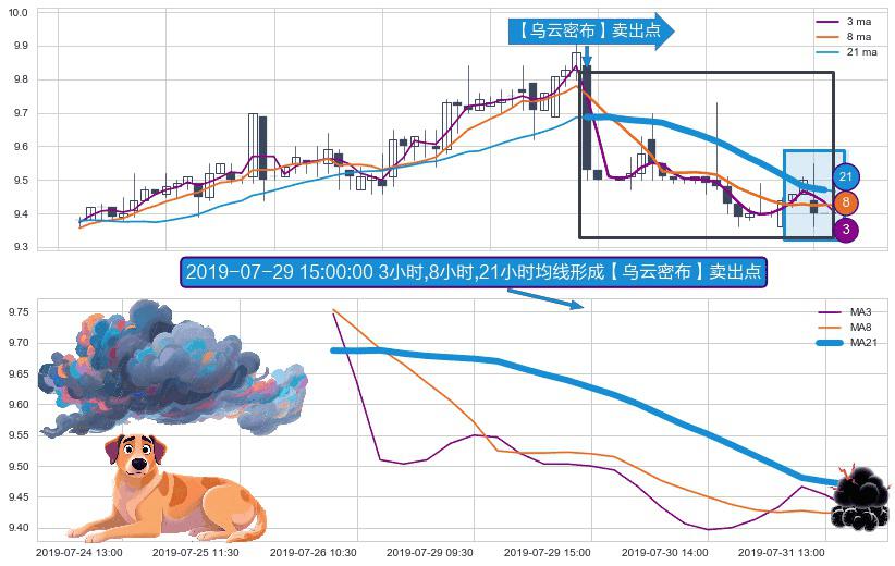 ⚀ 2019-07-26 09:30:00小时-2019-07-31 14:00:00小时显现 3小时-8小时-21小时均线 【乌云密布】卖出点 看空信号,后市看跌,卖出