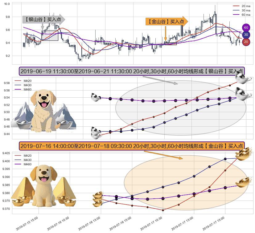 ⚀ 2019-07-16 15:00:00-小时至2019-07-18 09:30:00-小时显现 20小时-30小时-60小时均线 【金山谷】买入点 其再次确认了买入信号,可靠性更强,买入