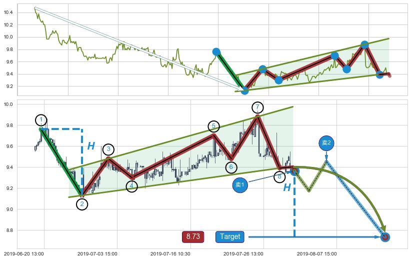 ➢ 【仅预测突破】最后价格:9.40与预测突破价格:9.36→【空间临近】后续最小【整理】第一目标价格→(08-15:12: 8.73 )