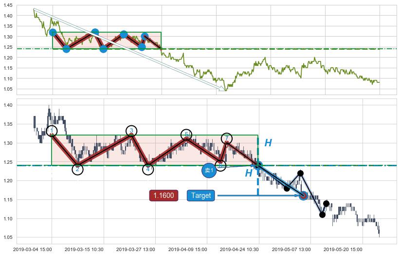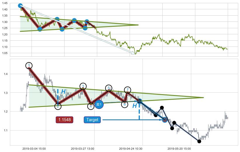 ➣ 最小中继整理跌幅→𝐇: 0.0800000 (上平行阻力线与下平行支撑线的垂直距离)