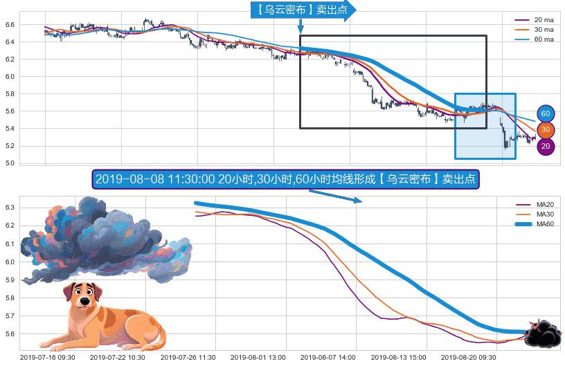 形态多维评估: ⚀ 2019-07-25 10:30:00小时-2019-08-22 11:30:00小时显现 20小时-30小时-60小时均线 【乌云密布】卖出点 看空信号,后市看跌,卖出
