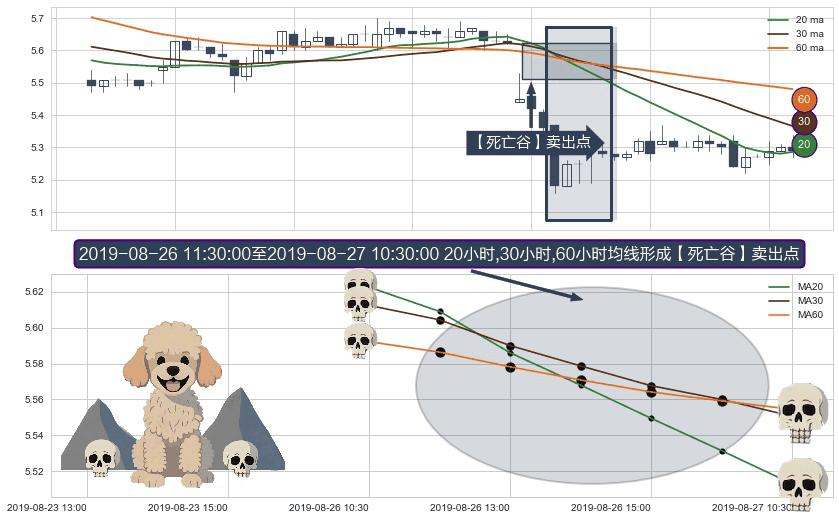 形态多维评估: ⚀ 2019-08-26 13:00:00-小时至2019-08-27 10:30:00-小时显现 20小时-30小时-60小时均线 【死亡谷】卖出点 看空信号,后市看跌,卖出