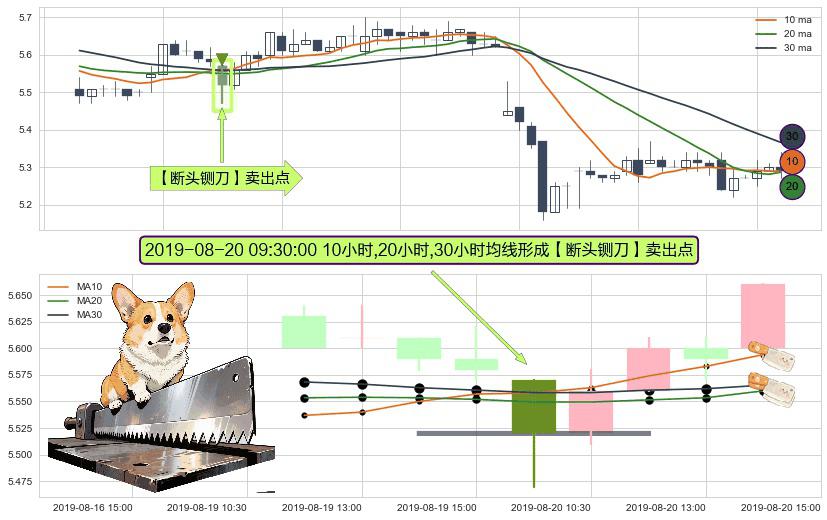形态多维评估: ⚀ 2019-08-20 09:30:00小时显现 10小时-20小时-30小时均线 【断头铡刀】卖出点 看空信号,后市看跌,卖出