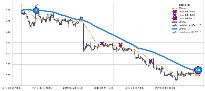 下跌趋势03-06 10:30-05-17 10:30,均线89, 90确认关键阻力1处