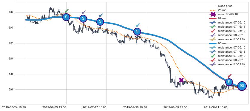 下跌趋势06-24 10:30-08-23 15:00,均线89, 90确认关键阻力5处
