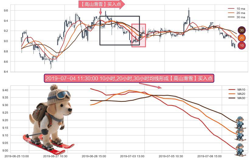 ⚀ 2019-06-28 10:30:00小时-2019-07-09 13:00:00小时显现 10小时-20小时-30小时均线 【高山滑雪】买入点 看多信号,后市看涨,买入