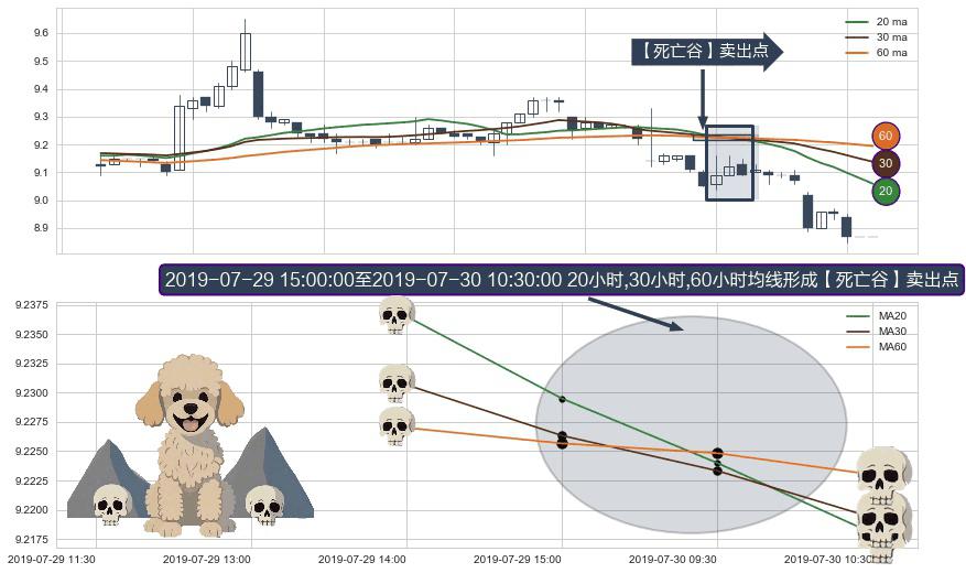 ⚀ 2019-07-30 09:30:00-小时至2019-07-30 10:30:00-小时显现 20小时-30小时-60小时均线 【死亡谷】卖出点 看空信号,后市看跌,卖出