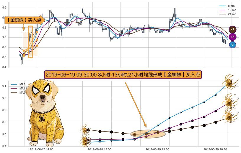 ⚀ 2019-06-19 09:30:00小时显现 8小时-13小时-21小时均线 【金蜘蛛】买入点 看多信号,后市看涨,买入