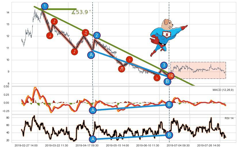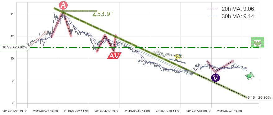 从2019-02-25 15:00至2019-06-21 15:00,共包含469个小时,阶段股价下跌-39.62%,阶段股价变动位移路程比: 1 : 7,下跌趋势角度: 53.9