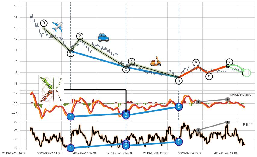 ➣ 第一, 三, 五浪下跌动能逐渐【衰弱变小】,趋势呈现不稳迹象