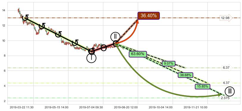➣ 调整浪已超过预测的c点位置,后续大趋势循环浪继续下跌概率63.60%,谨慎做多