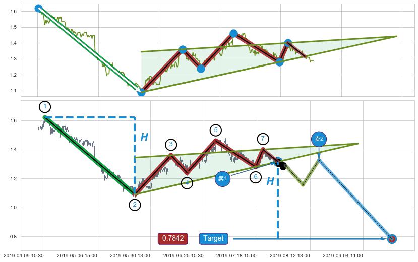 ➢ 升楔型:阻力位【③⑤⑦】不断走高,但对比下边上涨速度慢,构成【楔型】慢线