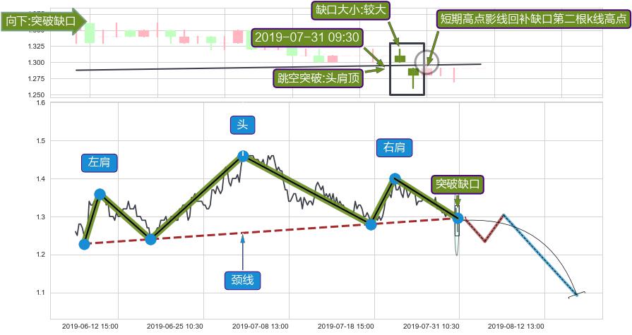 ➣ 突破缺口形成后,后续k不足7根,跳空突破头肩顶关键点后, 出现【轻微回踩】迹象,短期高点影线回补缺口第二根k线高点