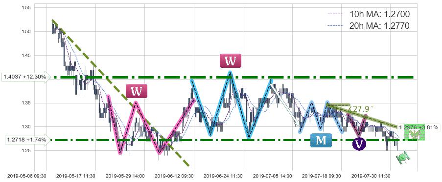 ♘ 阻力价格位1.2718,可信任强度73.94%,距离最后交易2019-07-31 15:00形成的收盘价格1.2500相差 +1.74%