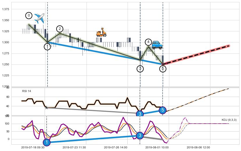 ➣ 第一, 三驱动浪端点:【KDJ】走势出现【常规背离 & 反转信号】背离程度57.86%,背离夹角角度56.9˚,背离程度中等