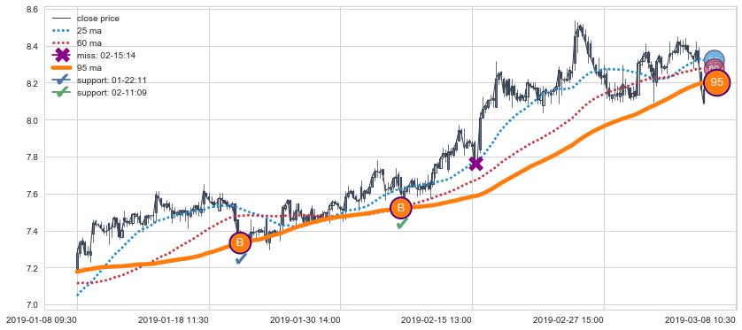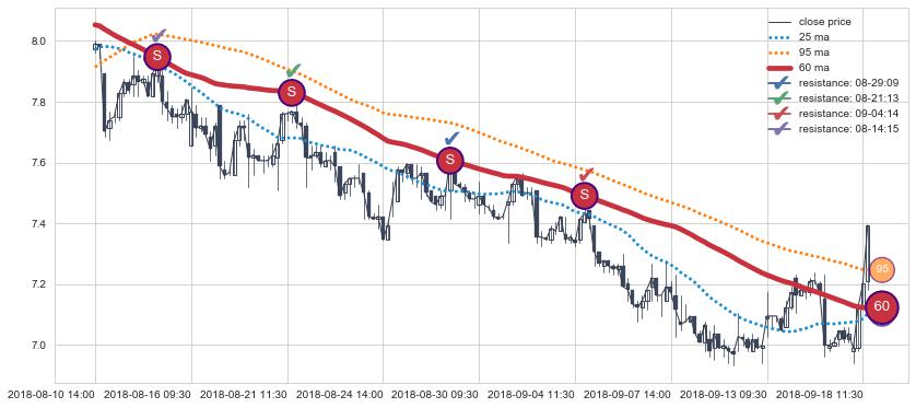➢ 最优均线组合共正确确认支撑阻力信号10处,正确确认率 71.43%