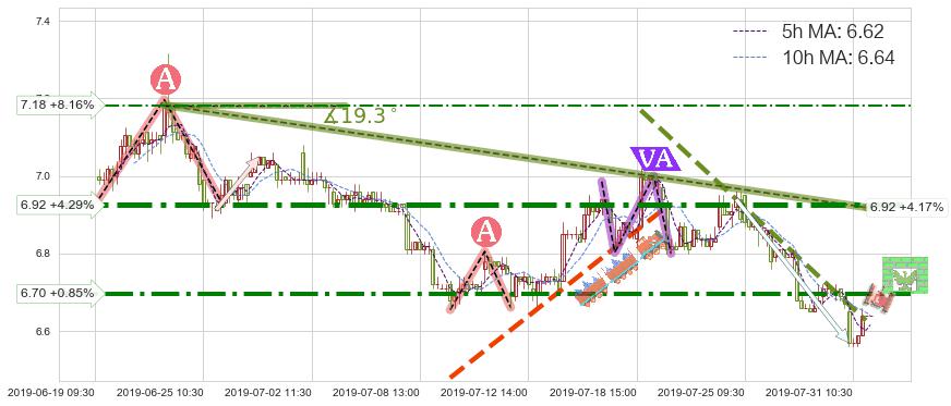 ♘ 阻力价格位6.70,可信任强度77.30%,距离最后交易2019-07-31 15:00形成的收盘价格6.64相差 +0.85%