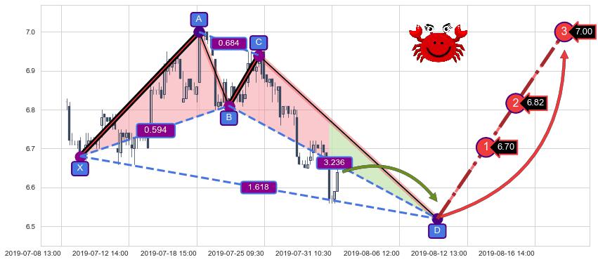 ➣ 未完成【螃蟹】形态起点X: 07-09:14, 已到达C点: 07-24:14, 预测最终D点: 08-08:14, 共128交易小时