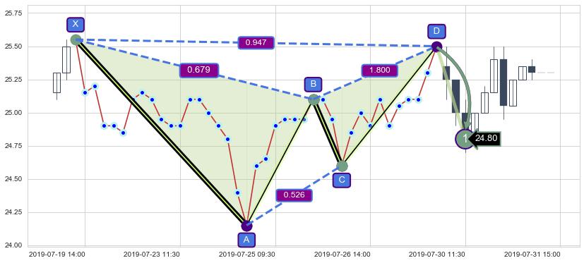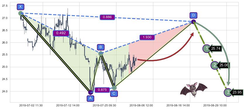 ➣ 未完成【蝙蝠】形态起点X: 06-24:11, 已到达C点: 07-24:13, 预测最终D点: 08-19:13, 共224交易小时