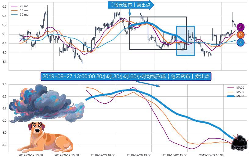 形态多维评估: ⚀ 2019-09-18 13:00:00小时-2019-10-10 11:30:00小时显现 20小时-30小时-60小时均线 【乌云密布】卖出点 看空信号,后市看跌,卖出