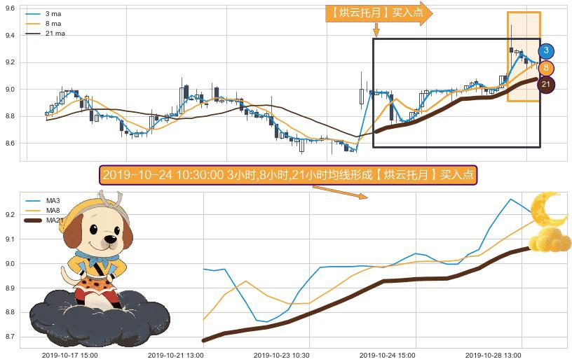 形态多维评估: ⚀ 2019-10-21 13:00:00小时-2019-10-28 15:00:00小时显现 3小时-8小时-21小时均线 【烘云托月】买入点 看多信号,后市看涨,买入