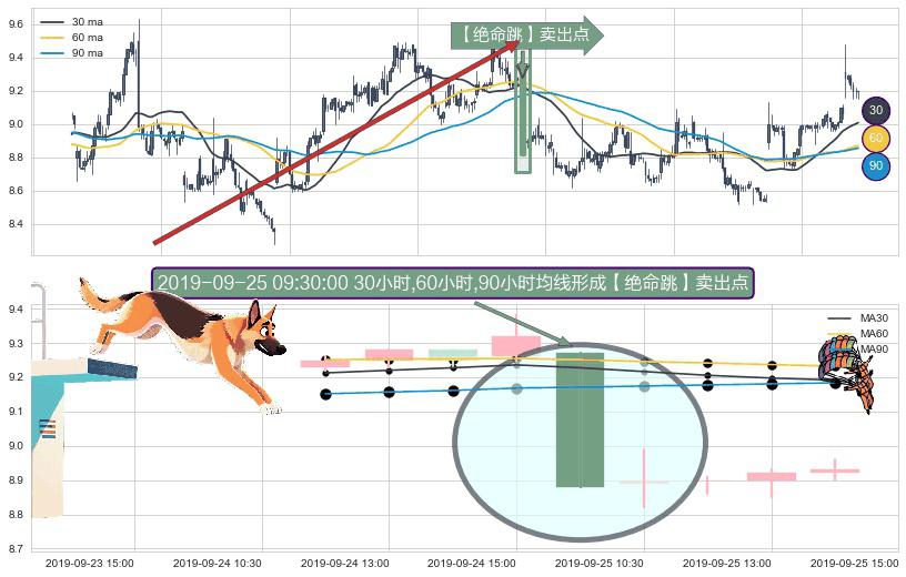 形态多维评估: ⚀ 2019-09-25 09:30:00小时显现 30小时-60小时-90小时均线 【绝命跳】卖出点 看空信号,后市看跌,卖出
